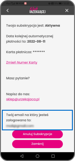 Poniżej znajdziesz informację na jakiego maila jesteś zalogowany do aplikacji.